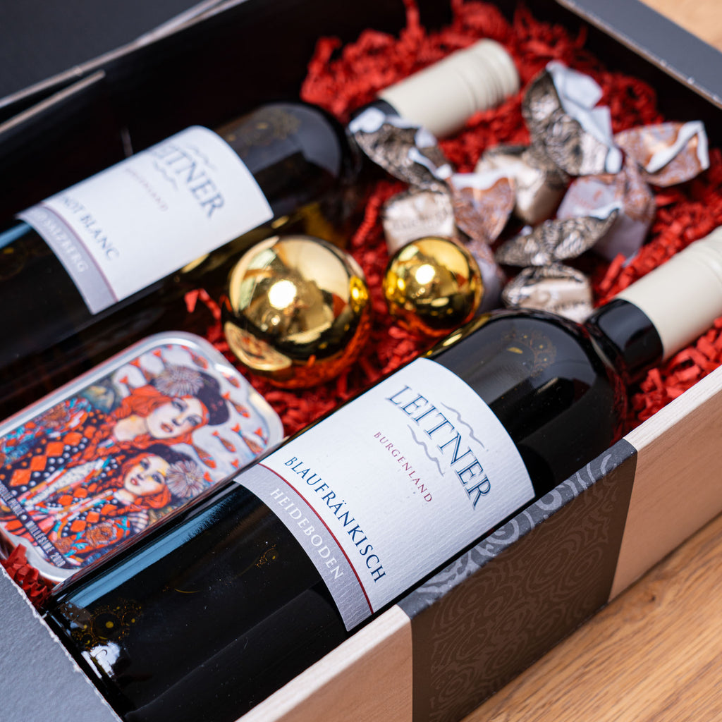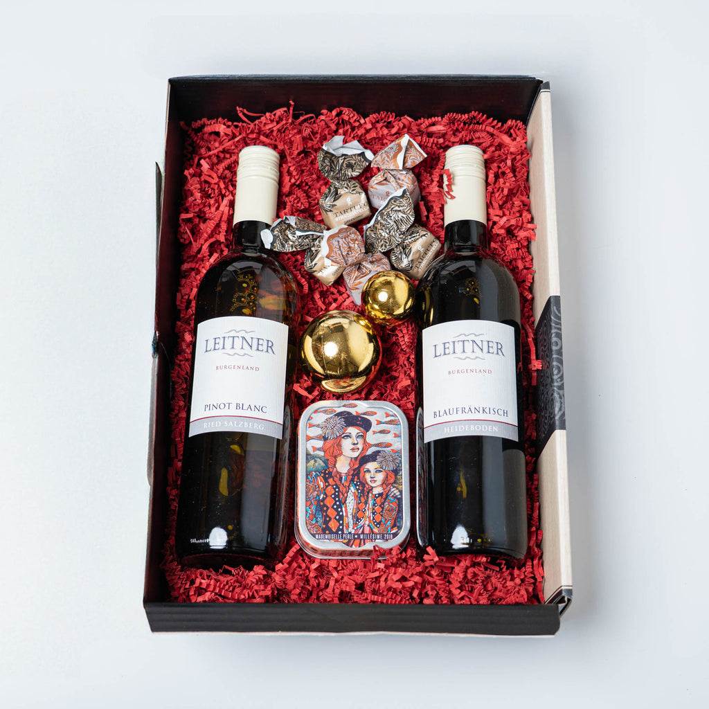 Ein Geschenkset voller weihnachtlicher Genussmomente: edle österreichische Weine, süße Trüffel-Pralinen aus Italien und feine französische Jahrgangssardinen. Perfekt für festliche Abende und als edle Überraschung unter dem Weihnachtsbaum.