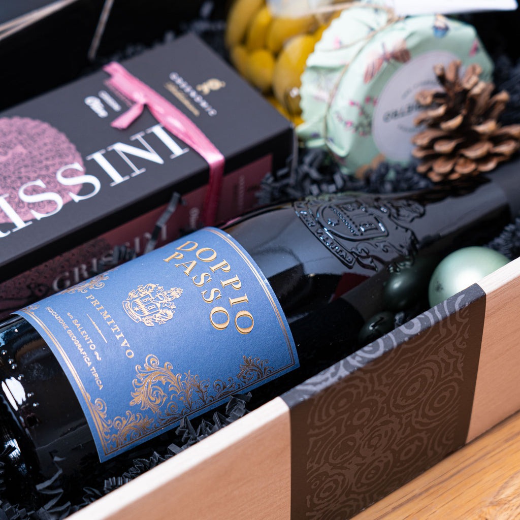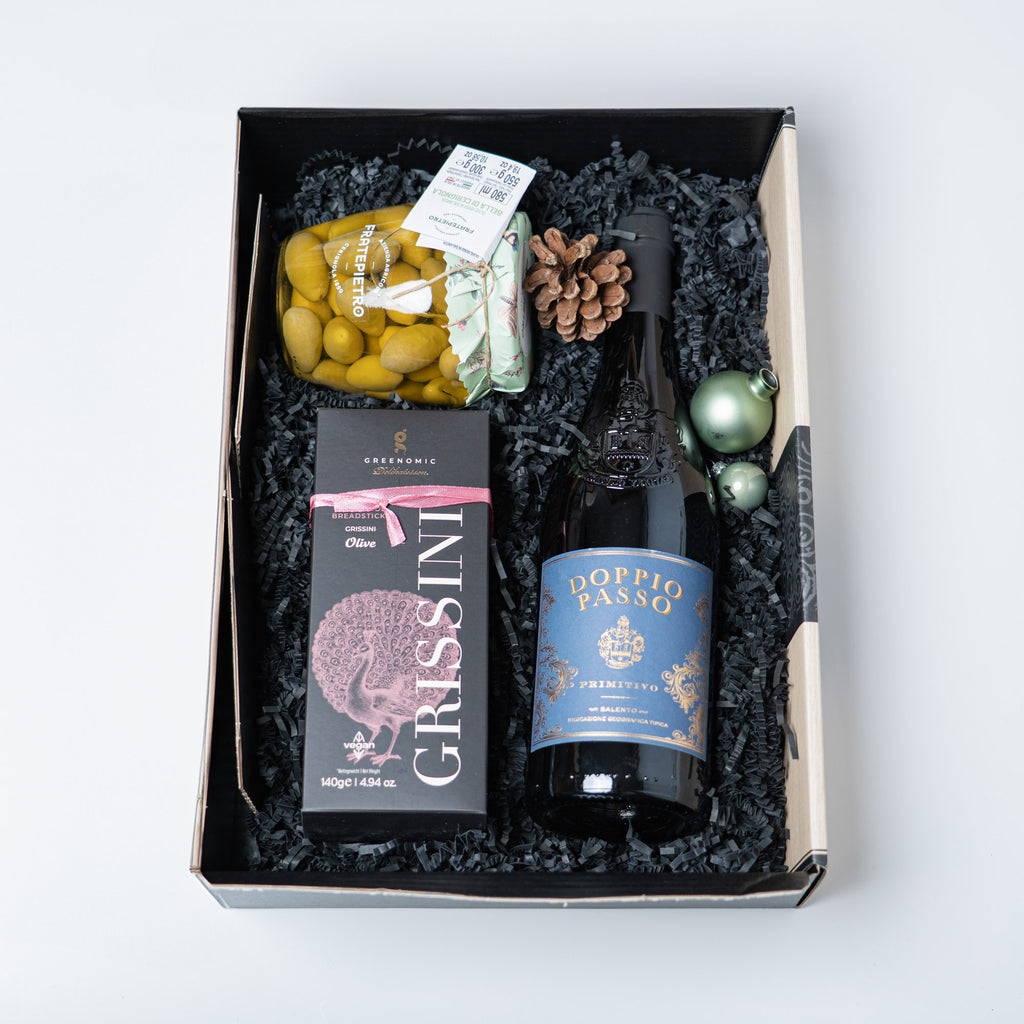 Ein Geschenkset voller mediterraner Aromen: kräftiger Primitivo aus Apulien, knusprige Oliven-Grissini und saftige Tafeloliven. Italienische Genussmomente, die Weihnachten besonders machen.