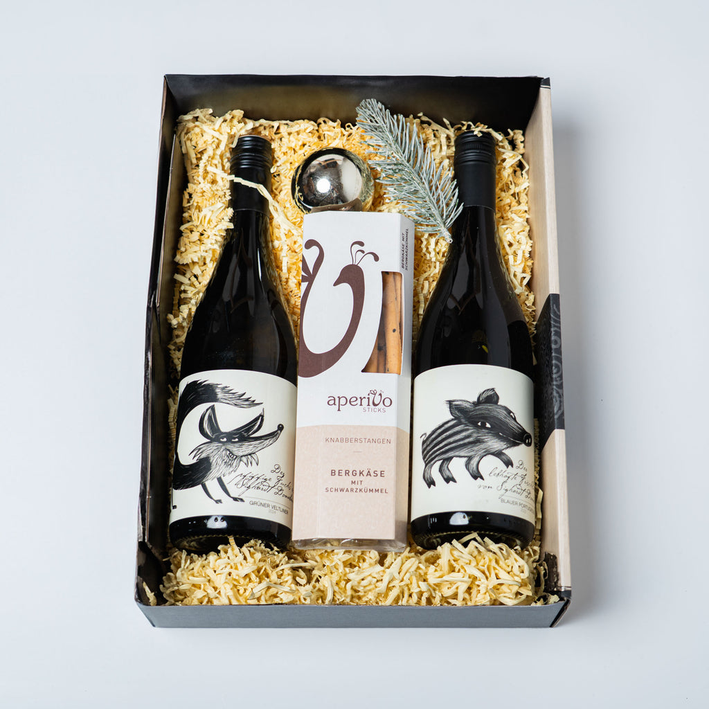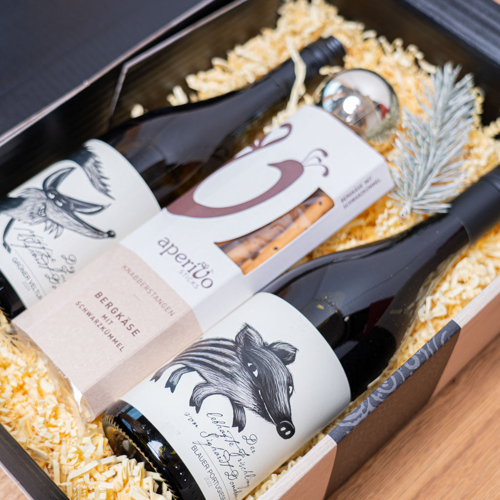 Ein festliches Geschenkset aus der Wachau: zwei elegante Weine von Donabaum Sighardt und feine Aperivo-Sticks aus Österreich. Ideal für Genießer, die Weihnachten mit authentischen Aromen feiern möchten.