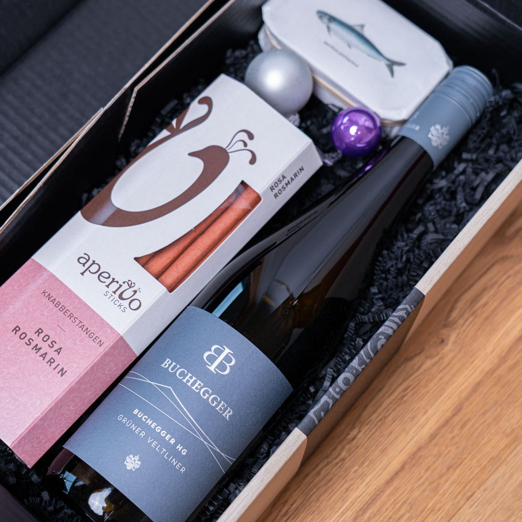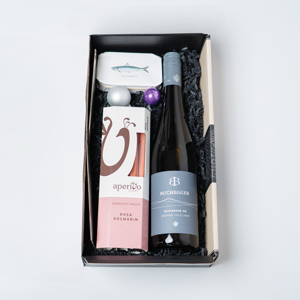 Ein edles Geschenkset mit internationalem Flair: Grüner Veltliner aus Österreich, knusprige Aperivo-Sticks aus dem Waldviertel und kostbare Jahrgangssardinen aus Spanien. Perfekt für kulinarische Genießer zu Weihnachten.
